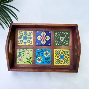 HANDCRAFTED MULTICOLOUR CERAMIC TILE WOODEN SERVING TRAY | FLORAL MOSAIC DESIGN | 6 TILE TRAY