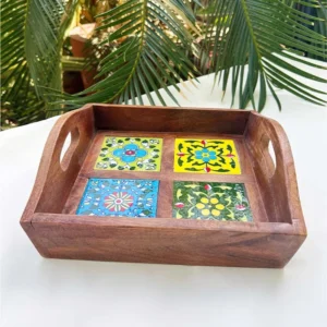 HANDCRAFTED MULTICOLOUR CERAMIC TILE WOODEN SERVING TRAY | FLORAL MOSAIC DESIGN | 4 TILE TRAY