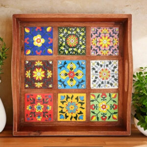 HANDCRAFTED MULTICOLOUR CERAMIC TILE WOODEN SERVING TRAY | FLORAL MOSAIC DESIGN | RECTANGULAR (9 TILE TRAY)
